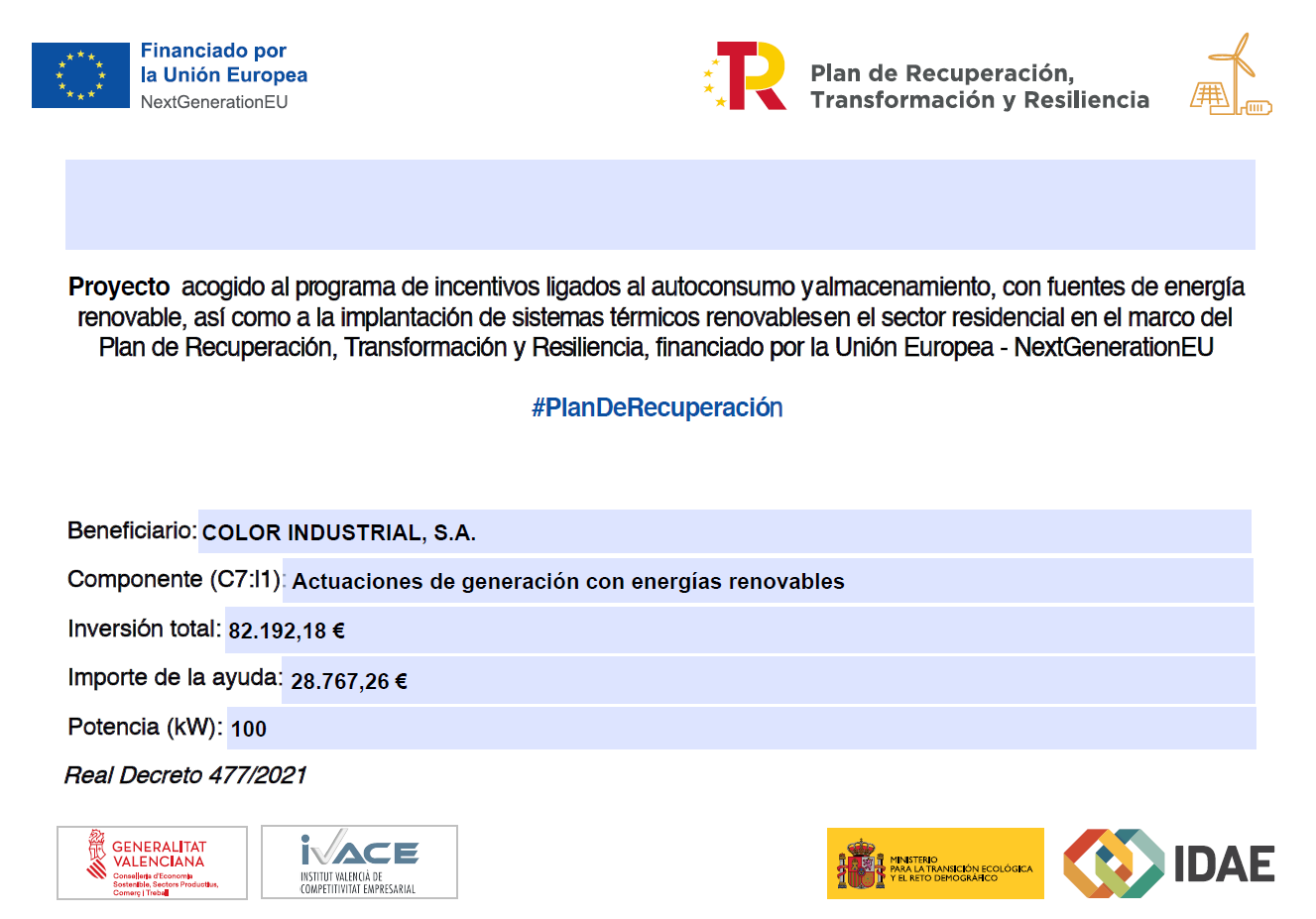 COLOR INDUSTRIAL SA, ha sido beneficiaria de una ayuda del programa de ayudas de LABORA Servicio Valenciano de Empleo destinada a fomentar la contratación indefinida inicial de colectivos de atención prioritaria para el empleo, cofinanciada por la Unión Europea, la Generalitat Valenciana y el Ministerio de Trabajo, Migración y Seguridad Social; por importe de 11.113 euros EXPEDIENTE: ECOVUL/2024/1041/46.
